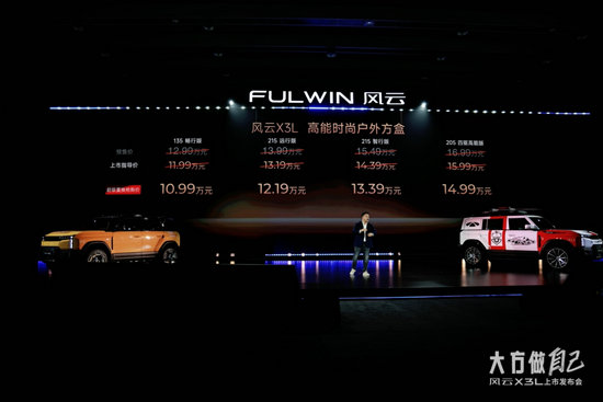 9月17日,风云X3L于成都举行上市发布会,正式售价为10.99万元起,共推出四个版本车型,135畅行版售价10.99万元、215远行版售价12.19万元、215智行版售价13.39万元、205四驱高能版售价14.99万元。同时,六大官改版型同步亮相。[