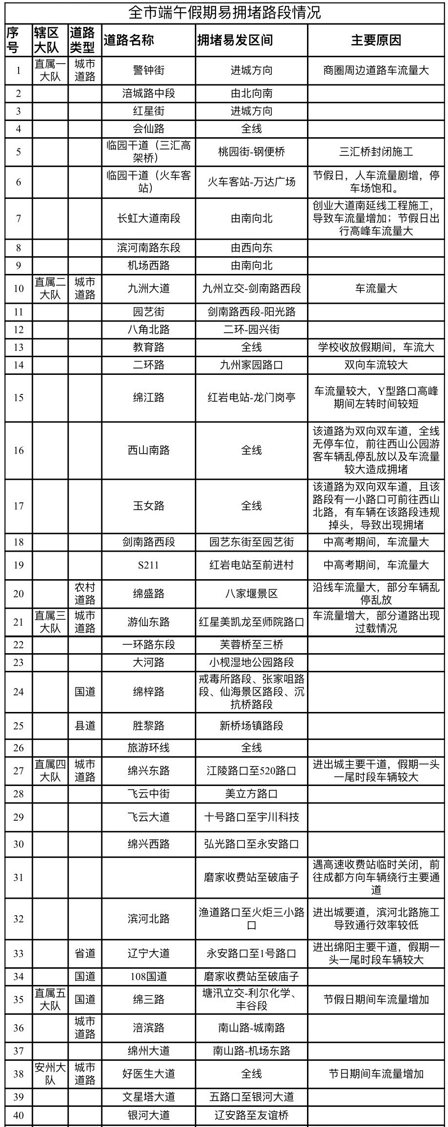 ◆6月7日,端午节前晚高峰与高考首日考生离散时段重叠,预计送考沿线道路以及进出城主要通道、长虹大道至绵州大道沿线、绵兴路至临园干道沿线、5条上下园艺山道路、各跨江桥面将出现较大流量情况,发生拥堵风险较高。