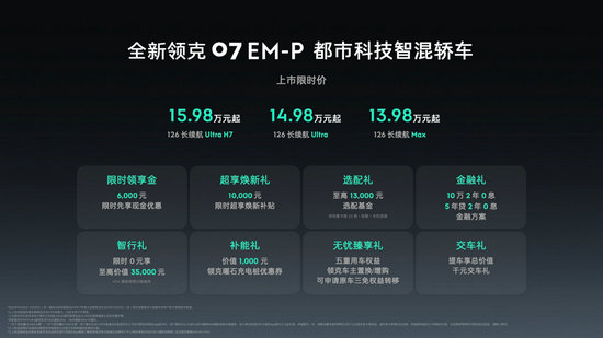 9月25日,都市科技智混轿车——全新领克07EM-P正式上市。新车共推出126长续航Max、126长续航Ultra、126长续航UltraH7三款配置版本,上市限时价13.98万元起。同时,全新领克07EM-P还准备了限时领享金、超享焕新礼、选配礼、金融礼、智行礼、补能礼、无忧臻享礼、交车礼在内的8重限时福利。