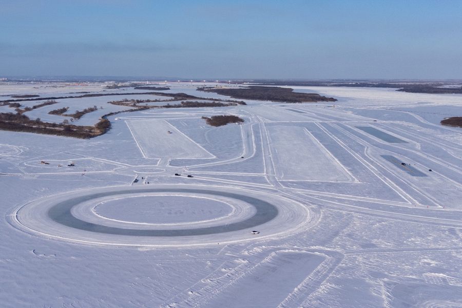 冰面上,十余台作业车辆正紧锣密鼓地维护专用冰道。随后,一辆辆测试车相继驶入,在冰层上疾驰、急刹、甩尾转向,场面蔚为壮观。