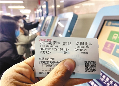 昨日,北京西站,一位旅客展示1月22日北京朝阳站至沈阳北站G913次高铁列车车票。新京报记者 王贵彬 摄