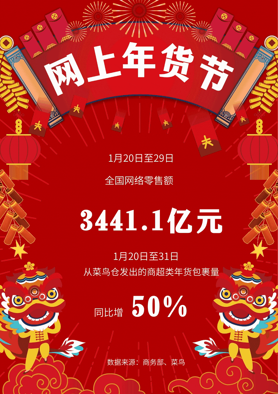 据商务部最新数据显示,自“2021全国网上年货节”启动以来,1月20日至29日(腊月初八至腊月十七)的10天,全国网络零售额达3441.1亿元人民币。