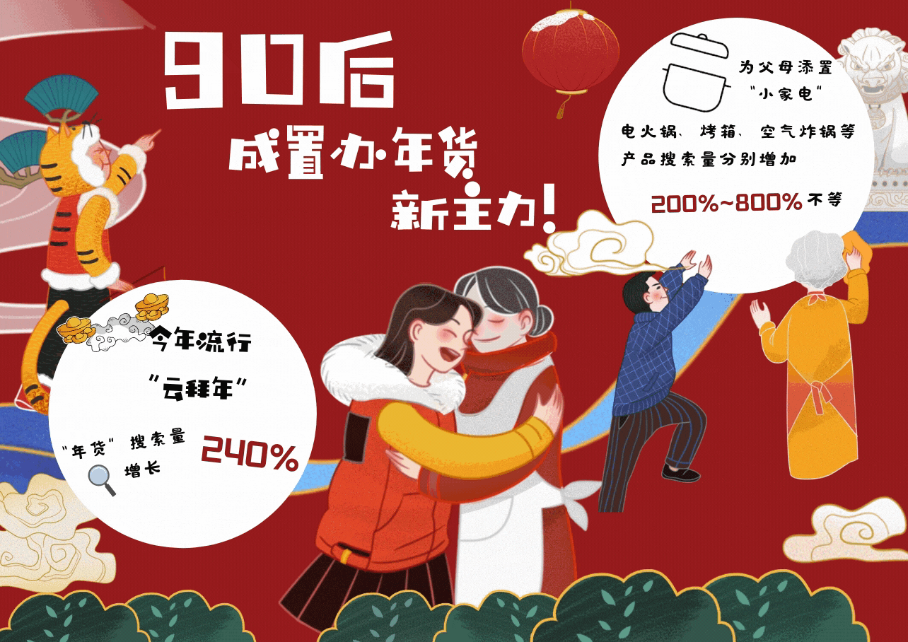 来自淘宝的数据显示,网上年货节开启首日,平台上的“年货”搜索量增长240%。而“90后”也首次接棒,成为置办年货新主力,在天猫年货节的下单比重超过六成。