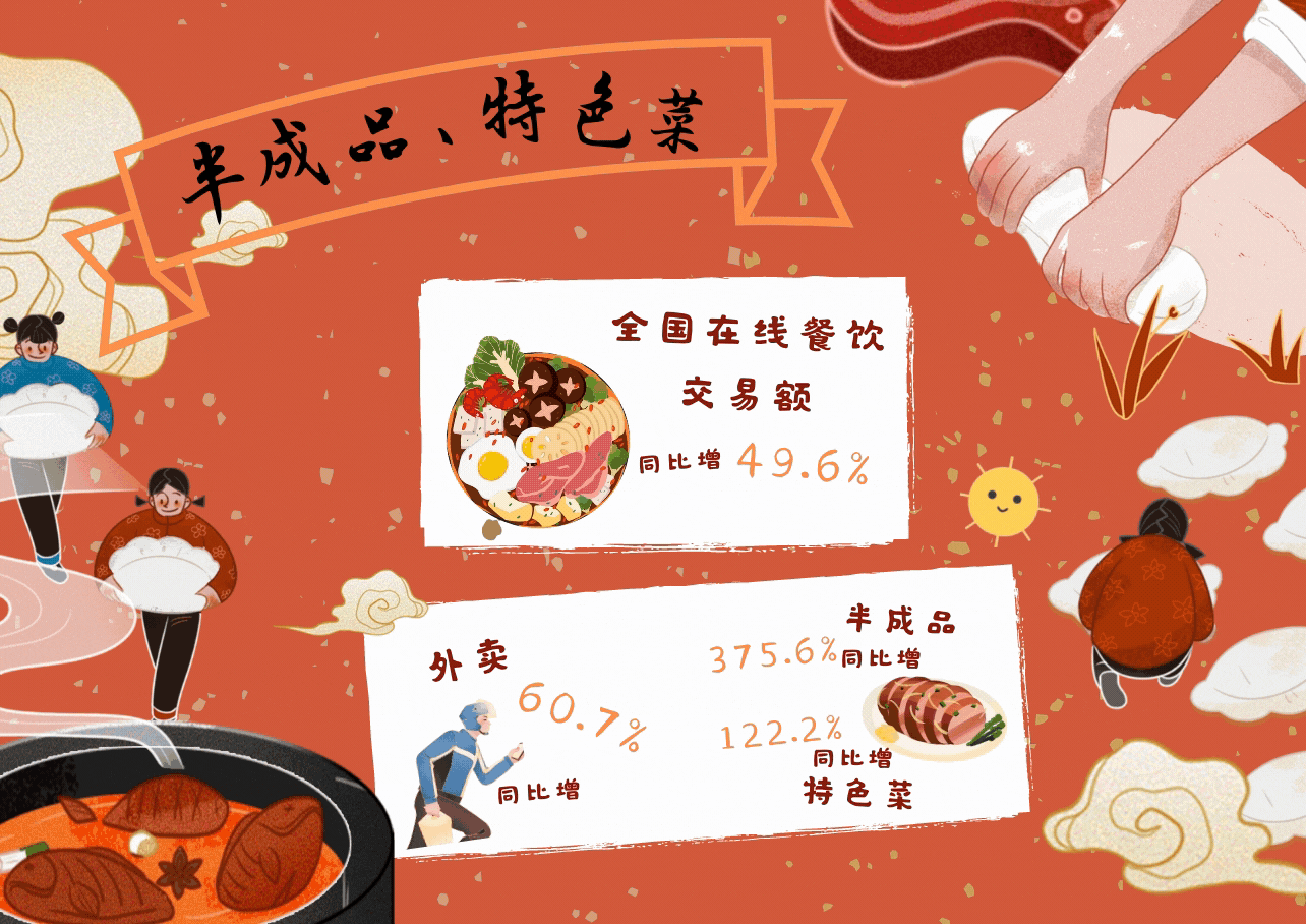 据商务部最新数据显示,年货节期间,全国在线餐饮交易额同比增长49.6%,外卖同比增长60.7%,半成品、特色年菜同比分别增长375.6%和122.2%。同期,中西部地区网络零售额同比增速较快,广西、江西分别增长35.9%和22.5%。