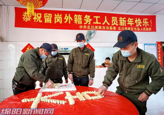 2月4日中午,位于北川经开区的绵阳军威模型有限公司职工食堂内,一片欢声笑语,20余位留岗人员与北川羌族自治县县政府、县总工会和县农民工服务中心的相关负责人一道包饺子、煮饺子、吃饺子,其乐融融共庆“小年”。