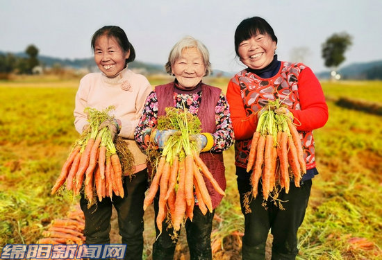 每年春节前后,正是胡萝卜采收上市的时节。近日,在位于游仙区忠兴镇木龙村的木龙观胡萝卜集中种植区里,菜农们正忙碌地将成熟的胡萝卜从地里挖出来,挑拣、装袋、运输,一派丰收的景象。“听我父亲说,这里种红萝卜的历史估计有几百年了!”正在忙着挑拣胡萝卜的当地村民黄菊兰乐呵呵地说,她家今年种了两亩多,每亩地估计要挣五六千元。通过建立合作社,集中流转土地、大户带小户集中抱团发展种植、统一销售等方式,木龙村的胡萝卜品质和产值稳步提升,每年到了上市时节,前来收购的商贩络绎不绝。