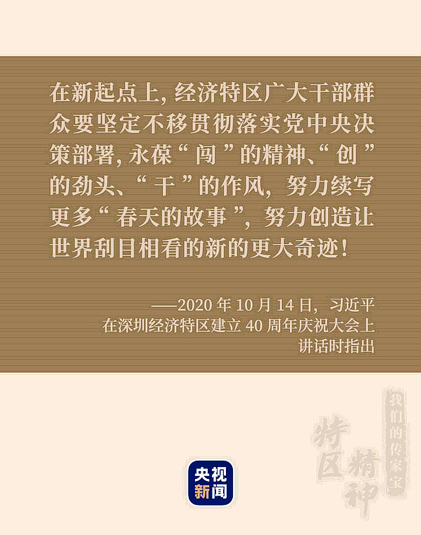 2020年10月14日,深圳经济特区建立40周年庆祝大会上,习近平指出,继续发扬敢闯敢试、敢为人先、埋头苦干的特区精神,激励干部群众勇当新时代的“拓荒牛”。