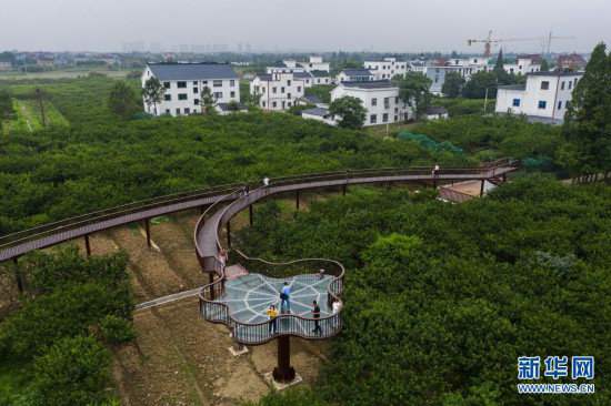 6月16日,游客在桃园村槜李园中新建成的栈道上观赏乡村美景(无人机照片)。