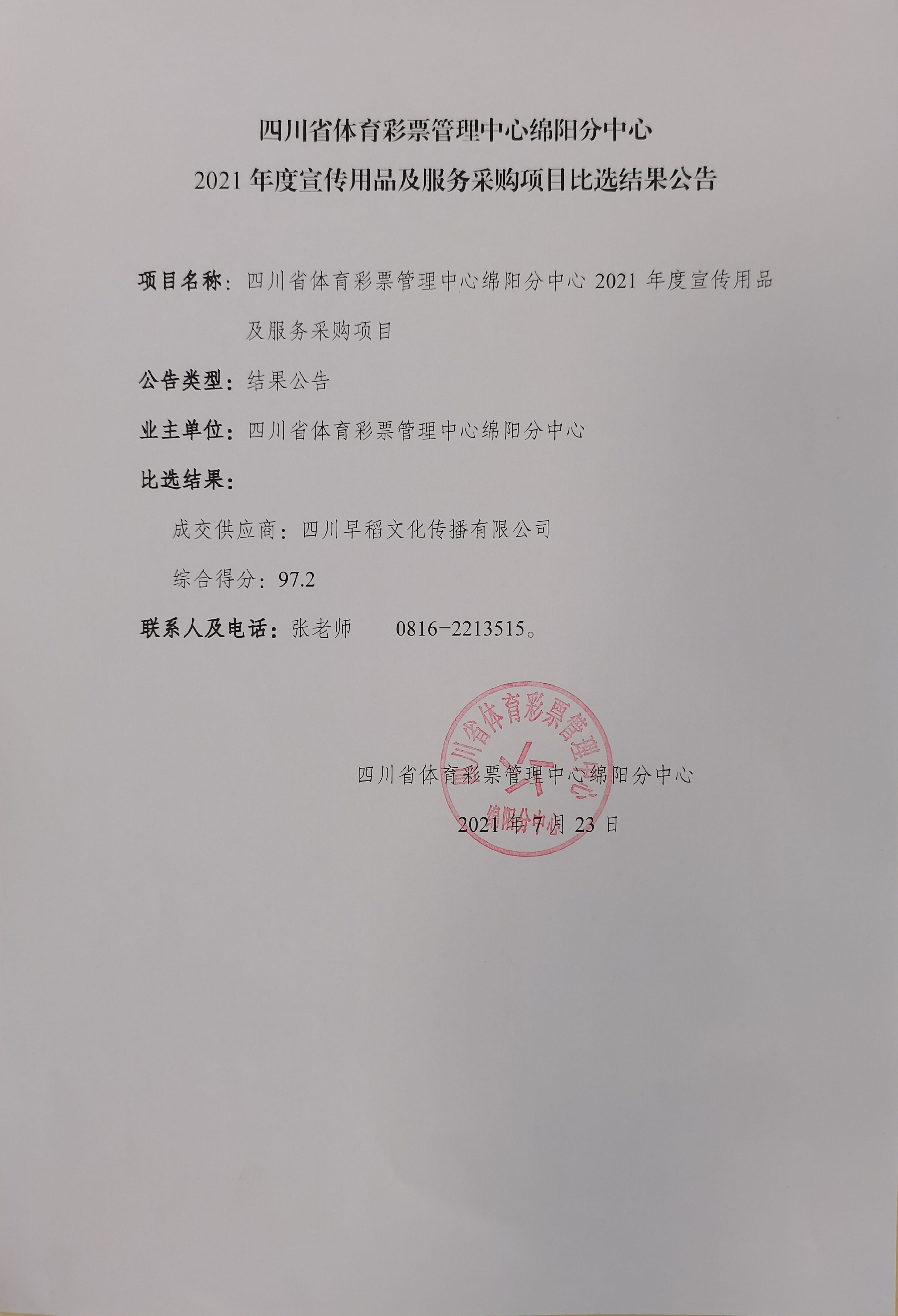 四川省体育彩票管理中心绵阳分中心2021年度宣传用品及服务采购项目比选结果公告