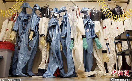 资料图:美国马里兰州德特里克堡的美国陆军传染病医学研究所实验室中,悬挂着隔离服。