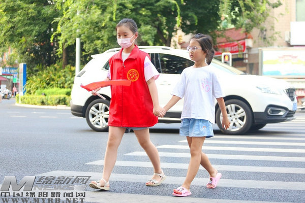近日,在东津路与沈家坝下街交会处,10岁的小志愿者勾一然牵着小朋友过斑马线,成为十字路口上的一道亮丽风景。