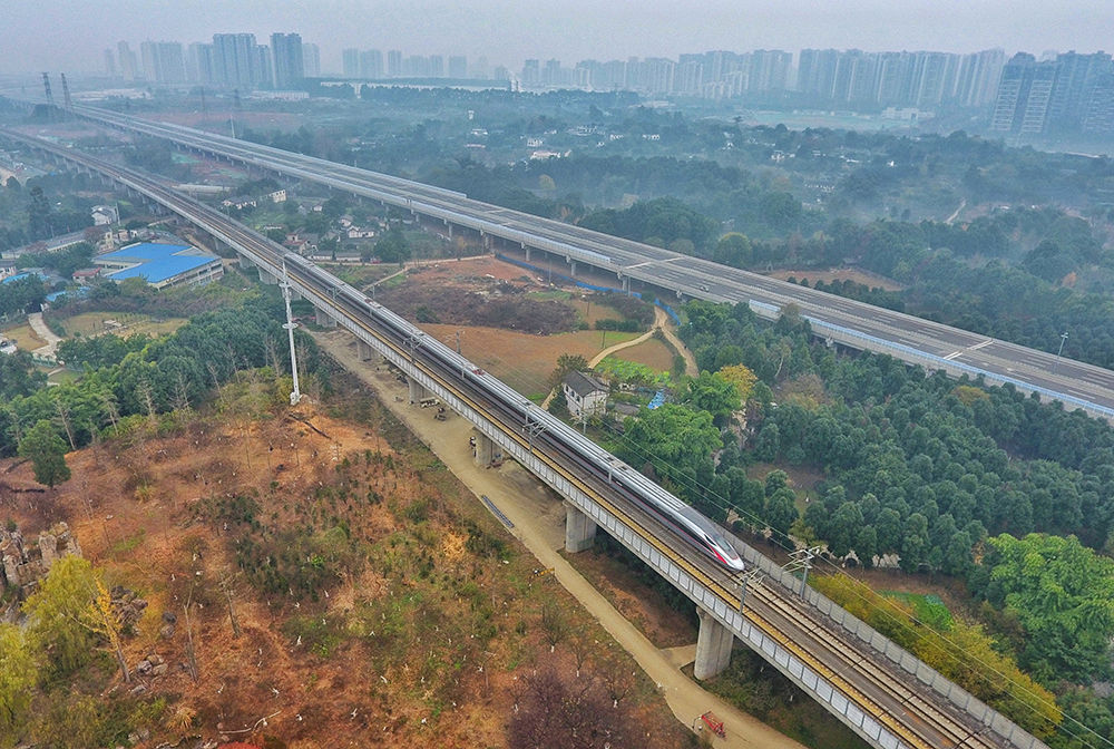 ↑G8607次“复兴号”高铁列车从成都东站出发开往重庆沙坪坝(2020年12月24日摄,无人机照片)。新华社记者 刘坤 摄