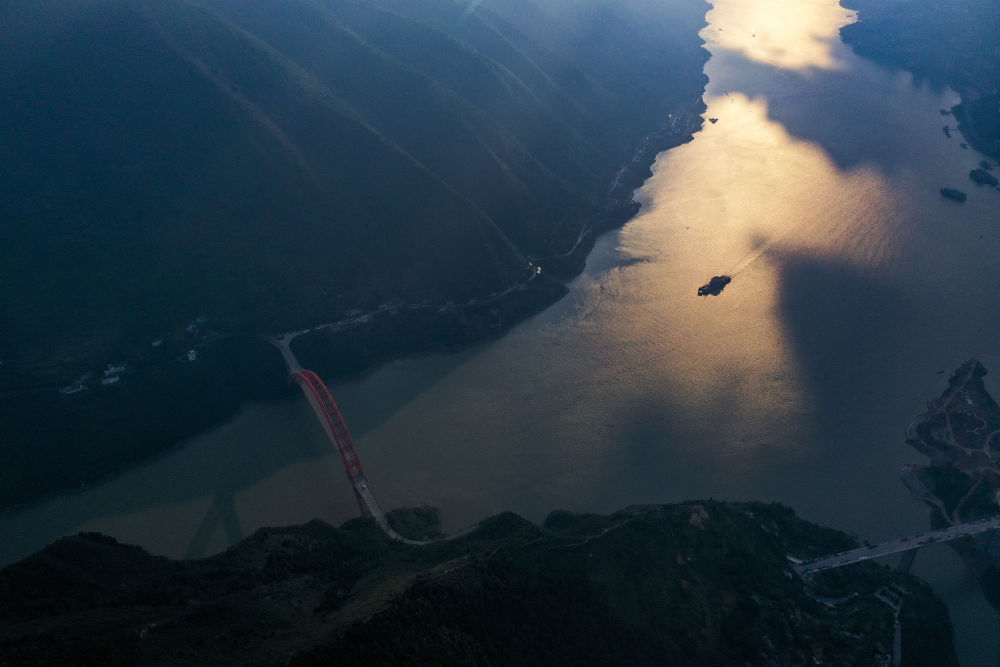 ↑落日余晖下,一艘货轮驶向长江三峡的巫峡(2021年10月5日摄,无人机照片)。新华社记者 刘潺 摄