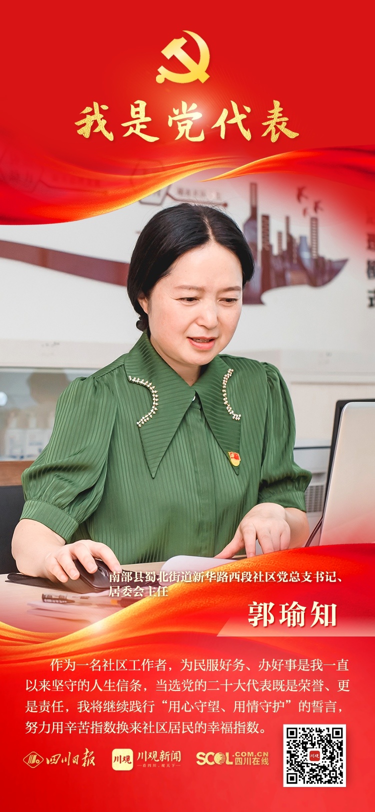 郭瑜知,南充市南部县蜀北街道新华路西段社区党总支书记、居委会主任,从事社区工作18年。2020年12月获“全国抗击新冠肺炎疫情优秀城乡社区工作者”称号。所在社区党总支曾获评“全国基层低保规范化建设典型单位”“全省先进基层党组织”。