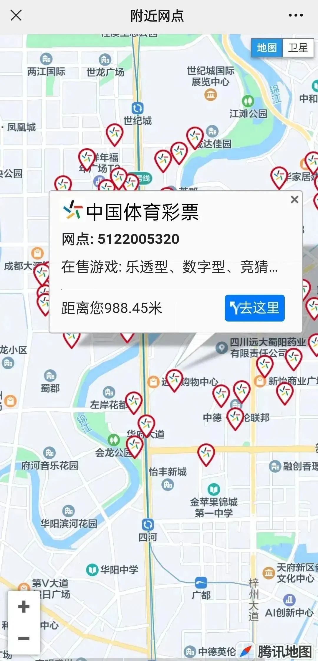 关注四川体彩微信订阅号(微信号:sctcweixin),点击菜单栏“附近体彩店”按钮,即可找到“附近网点”地图,点击体彩店图标即可查看门店编号、在售游戏、地址、联系电话等信息。