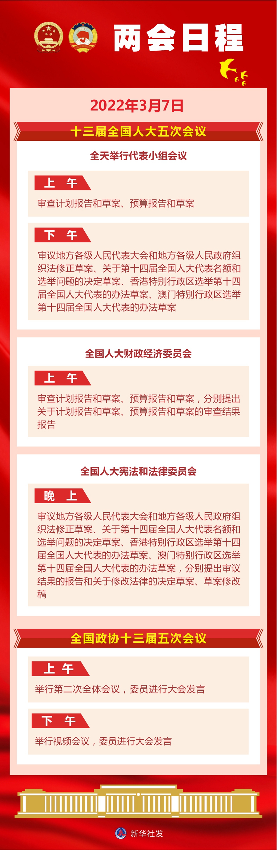 新华社北京3月6日电 7日,十三届全国人大五次会议全天举行代表小组会议。上午,审查计划报告和草案、预算报告和草案;下午,审议地方各级人民代表大会和地方各级人民政府组织法修正草案、关于第十四届全国人大代表名额和选举问题的决定草案、香港特别行政区选举第十四届全国人大代表的办法草案、澳门特别行政区选举第十四届全国人大代表的办法草案。