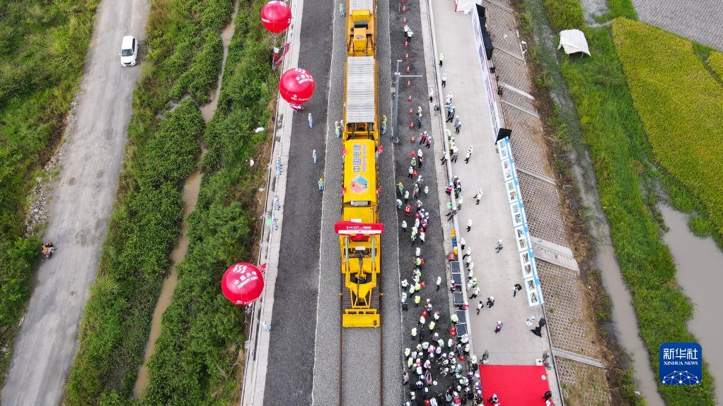 这是4月20日在印度尼西亚万隆拍摄的雅万高铁铺轨施工现场(无人机照片)。新华社记者 徐钦 摄
