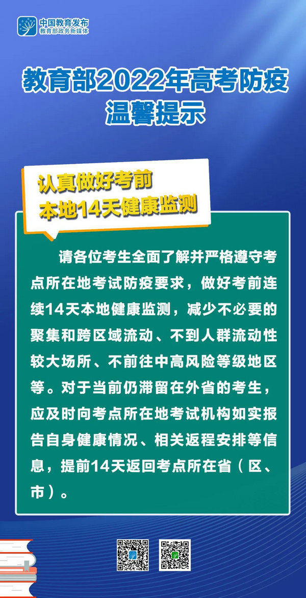 为切实保障广大考生和考试工作人员的生命安全和身体健康,确保2022年全国高考平稳、有序举行,按照教育部、国家卫生健康委关于高考防疫工作的有关要求,近期,各地已陆续向2022年高考考生发布参加高考的注意事项。教育部再次提醒全体考生——