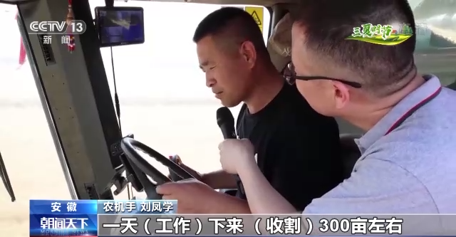 农机手 刘凤学:一小时(收割)30亩左右,一天(工作)下来(收割)300亩左右。尽量一亩田减少损失50斤左右,做到颗粒归仓。