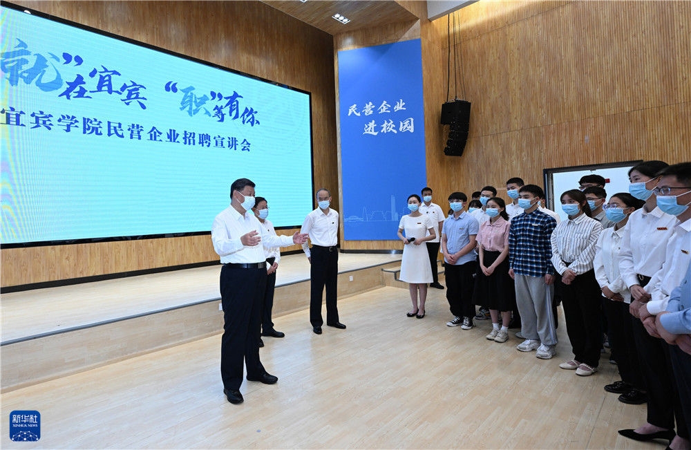 6月8日,中共中央总书记、国家主席、中央军委主席习近平在四川考察。这是8日下午,习近平在宜宾学院考察时,向正在参加企业招聘宣讲会的教师、学生、企业负责人了解企业招工需求和毕业生签约率等情况。新华社记者 李学仁 摄