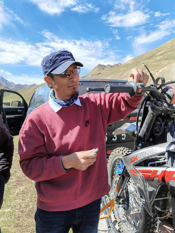 管护员强巴出发前调试巡逻用摩托车。(受访者提供)
