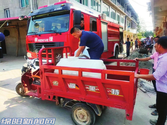 盐亭县消防救援大队为群众送水。(绵报融媒记者 任明勇 摄)