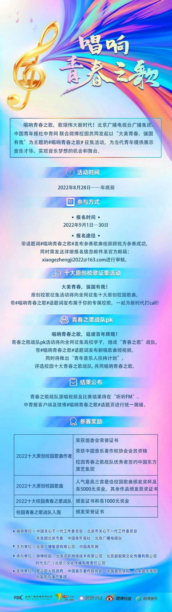 8月28日,首届新时代校园歌曲征集展播活动暨校园青春之歌战队大赛启动。活动由北京广播集团与中国青年网主办,以“大美青春、强国有我”为主题,通过微博话题#唱响青春之歌#,向全网征集原创校园歌曲。中国关心下一代工作委员会、北京市关心下一代工作委员会、共青团北京市委、中国青年报社、北京广播电视台具体指导活动开展。