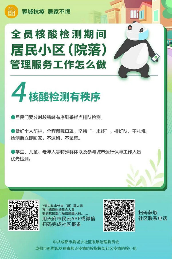 在全员核酸检测期间,居民小区(院落)管理服务工作怎么做?9月5日,成都市委社治委发布相关指南。