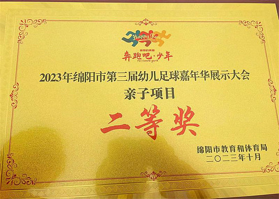 10月28—29日,“奔跑吧.少年”2023年绵阳市第三届幼儿足球嘉年华展示大会在绵阳市南河体育馆举行。本届比赛由绵阳市教育和体育局主办,全市共45所幼儿园参赛。梓潼县东风幼儿园选派的10名小运动员参加了全部比赛项目(五人趣味活动类、亲子类、个人类足球),并荣获佳绩。