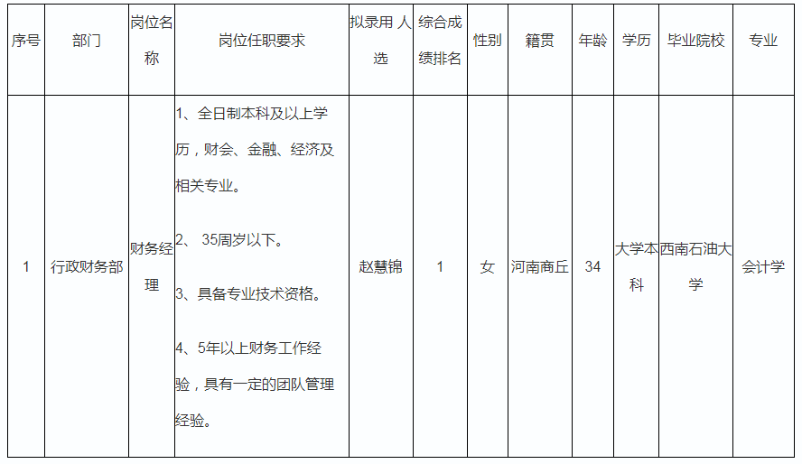 根据成都长虹融资租赁有限责任公司发布的招聘公告及招聘相关规定,经面试、考察、体检等程序,拟录用赵慧锦同志到成都长虹融资租赁有限责任公司工作,现予以公示,具体情况如下: