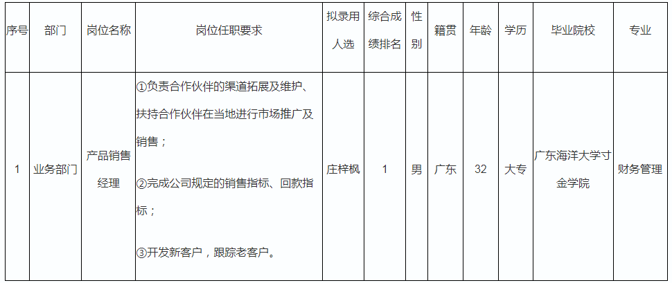 根据四川长虹佳华信息产品有限责任公司发布的招聘公告及招聘相关规定,经笔试、面试、考察、体检等程序,拟录用庄梓枫同志到四川长虹佳华信息产品有限责任公司工作,现予以公示,具体情况如下: