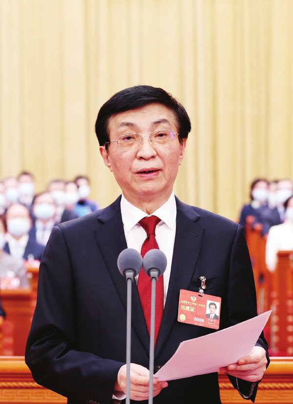 十三届全国政协主席汪洋代表政协第十三届全国委员会常务委员会向大会报告工作。 (新华社记者 丁海涛 摄)