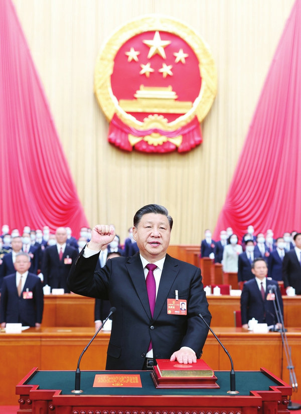3月10日,十四届全国人大一次会议在北京人民大会堂举行第三次全体会议。习近平全票当选中华人民共和国主席、中华人民共和国中央军事委员会主席。这是习近平进行宪法宣誓。(新华社记者 鞠鹏 摄)