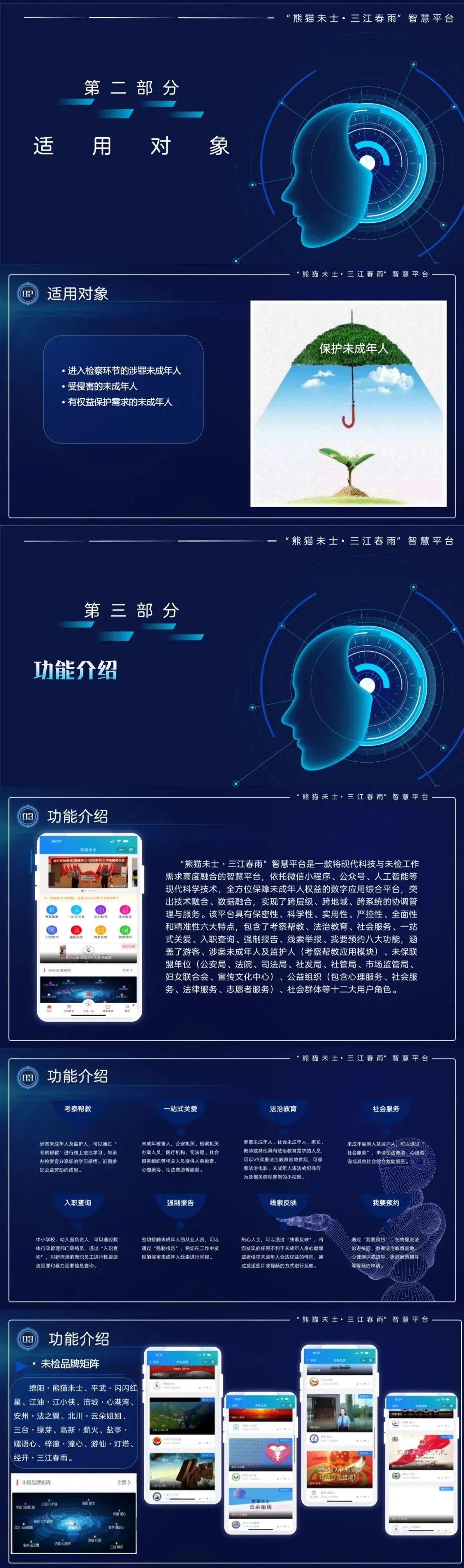 据了解,“熊猫未士·三江春雨”未保智慧平台是一款将现代科技与未检工作高度融合的智慧平台,依托微信小程序、公众号、人工智能等全方位保障未成年人合法权益,适用于进入检察环节的涉罪未成年人、受侵害的未成年人、有权益保护需求的未成年人。该平台实现了线上线下的无缝衔接,旨在为未成年人提供更加方便、快捷的绿色保护通道,努力构建共建、共治、共享的未成年人保护社会治理新格局,全方位推动绵阳未成年人保护工作高质量发展。