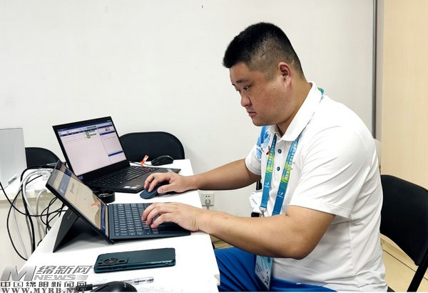 8月2日下午,记者来到成都双流体育中心竞赛秘书办公室,见到了裁判员王垒。他正在仔细查看各种比赛信息和表格,两只手飞速地在两台电脑间操作。
