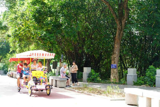 游客在柳州市环江村内骑行(8月8日摄)。新华社记者 赵欢 摄