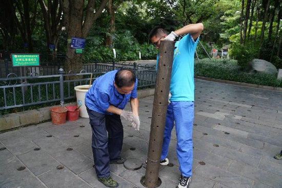 柳州市柳侯公园的工作人员对古树开展施肥复壮工作(8月8日摄)。新华社记者 赵欢 摄