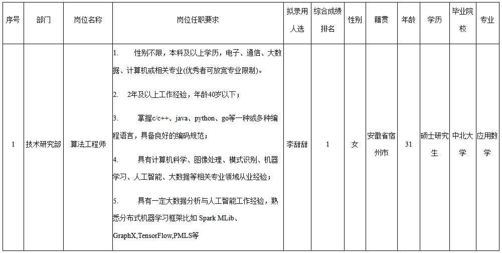 根据四川虹美智能科技有限公司发布的招聘公告及招聘相关规定,经笔试、面试、考察、体检等程序,拟录用李甜甜同志到公司工作,现予以公示,具体情况如下: