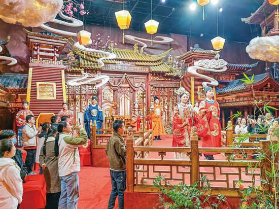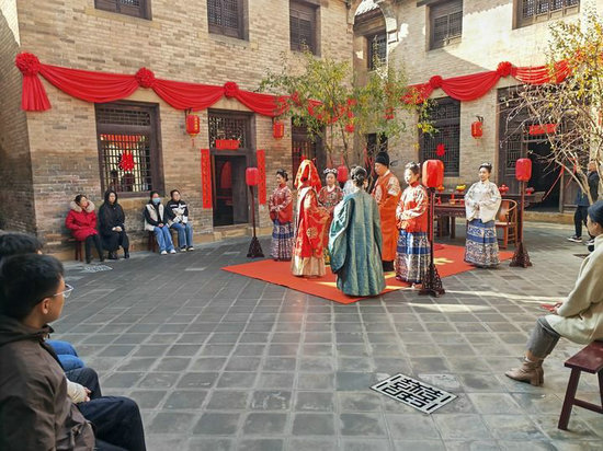 喜镇苏庄的古院落中,正在上演一场“出阁礼”表演,吸引游客前来参观。新华每日电讯记者许雄 摄