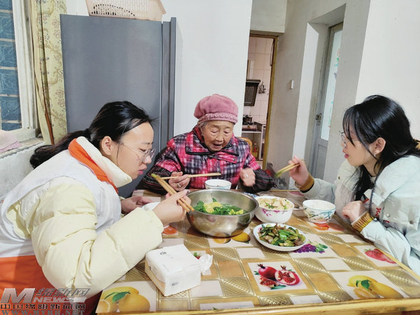 “开饭啰!”中午12点,莴笋蒜苗炒肉、红烧豆腐、鸡蛋豌豆尖汤被端上桌,一桌家常菜美味而温馨,三人陪着陈婆婆边吃边聊,餐后,收拾清洗好碗筷,将屋子收拾得井井有条。“这些孩子就像自己的‘儿女’一样,帮我买菜、做饭,陪我拉家常,有他们的陪伴我感觉很幸福。”陈婆婆说。
