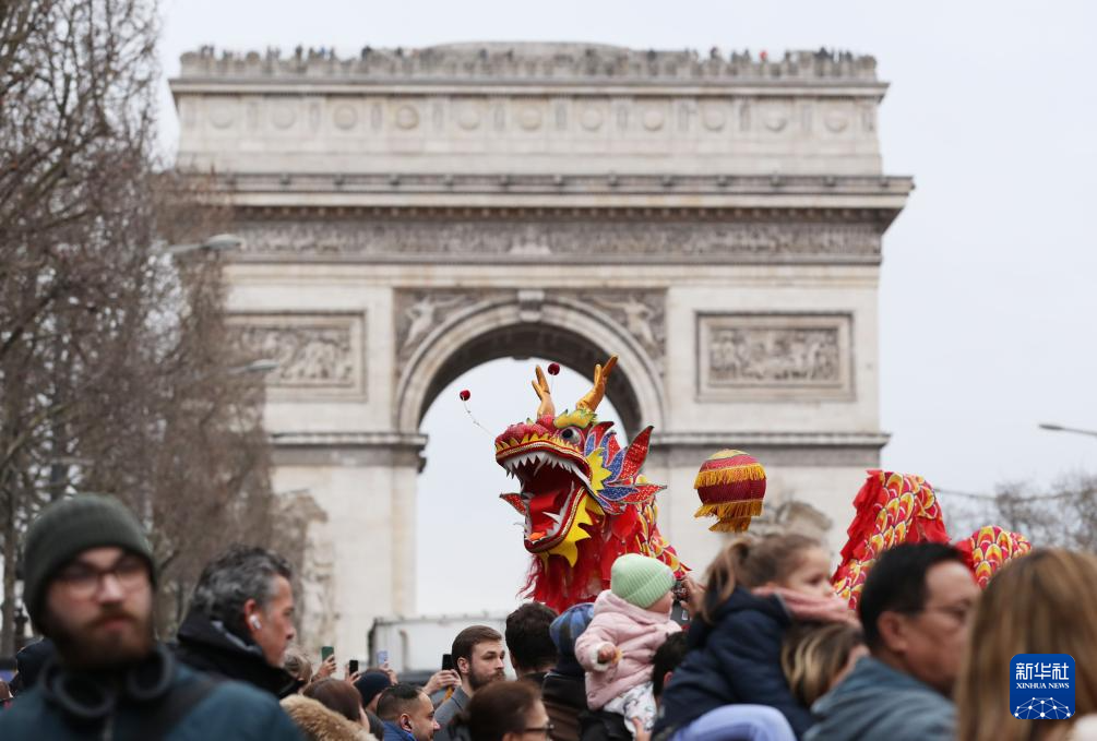 2月4日,人们在法国巴黎香榭丽舍大街观看舞龙舞狮表演。