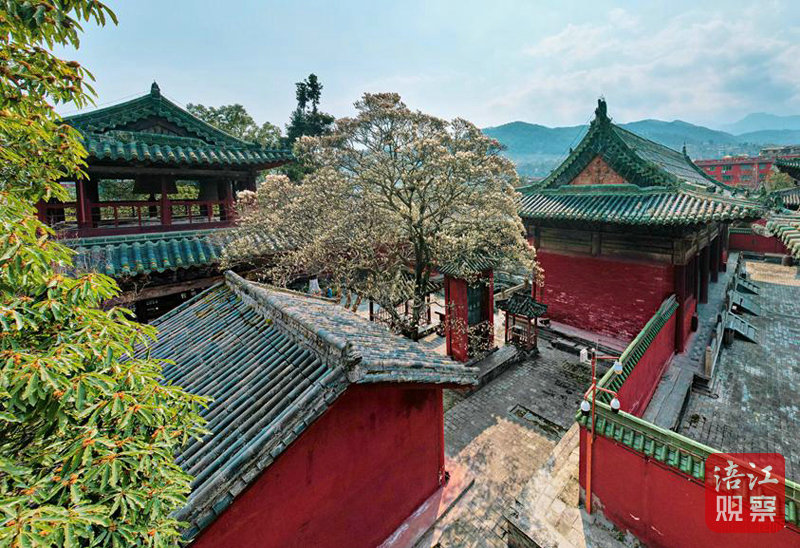 黄色的琉璃瓦、红色的墙壁,正是引人之处,尤其是满树白色的玉兰花盛开时,处处透露着古韵。