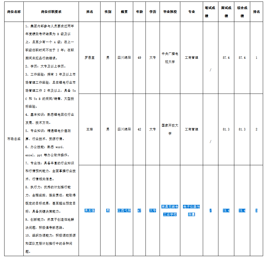 根据江西格润新材料有限公司发布的招聘公告及招聘相关规定,经面试程序,现将面试成绩予以公示。