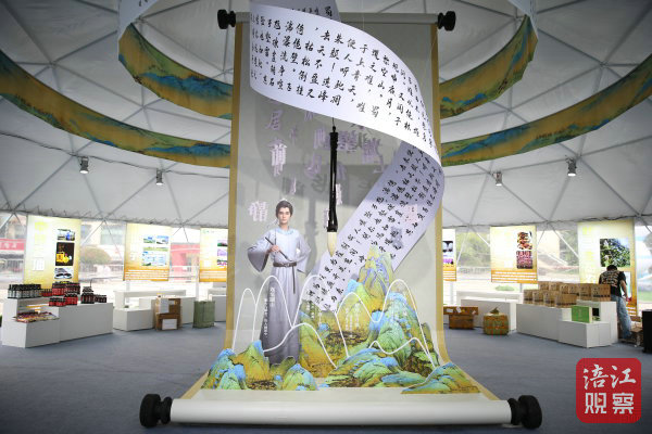 继续前行,此次活动的主题县江油馆便呈现在眼前。入馆后,中心位置打造了太白立体画轴创意造型,画轴以李白诗词为屏,画轴前方为立体的奇山异水造型,向杭州市民展示“蜀道太白乡,诗意栖居地”的浪漫江油。同时,集合江油文旅资源、非遗传承、文创产品、李白文化推广等板块内容进行展示。