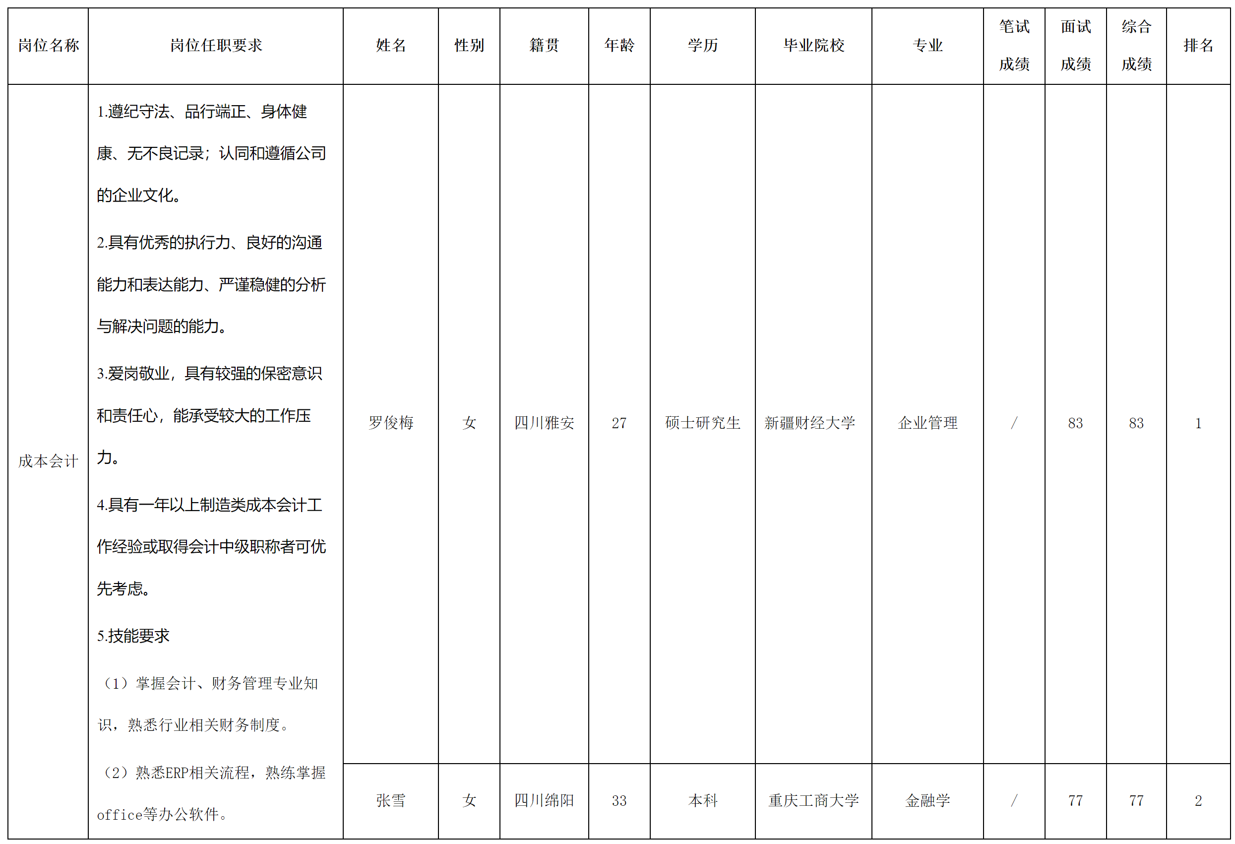 根据四川长虹新能源科技股份有限公司发布的招聘公告及招聘相关规定,经面试等程序,现将面试成绩予以公示。