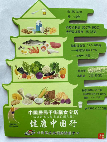 “油25-30克、盐<5克、每天活动至少6000步……”在预防日宣传教育周,一份《居民平衡膳食宝塔》生动地告知了大家一日三餐建议摄入量。