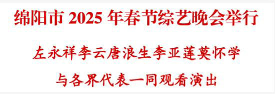 绵阳新闻网讯 金龙摆尾辞旧岁,灵蛇昂首启新篇。1月25日,绵州大剧院内座无虚席,由市委、市政府主办的绵阳市2025年春节综艺晚会在这里举行。副省长、市委书记左永祥,市委副书记、市长李云,市人大常委会主任唐浪生,市政协主席李亚莲,市委副书记莫怀学等市领导与来自全市各个行业、各条战线的代表欢聚一堂,观看演出,共迎新春佳节的到来。