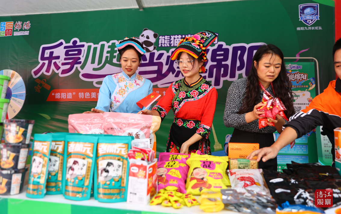 展区内,来自绵阳的商家正忙着向聚集的人群介绍产品故事。在绵阳米粉品尝台前,热气腾腾的米粉刚端上桌,便被等候的市民一抢而空;江油肥肠的香气飘出数米,引得路过的球迷频频驻足;杰克熊猫啤酒、特色农产品等展台前,也围满了咨询、选购的游客。