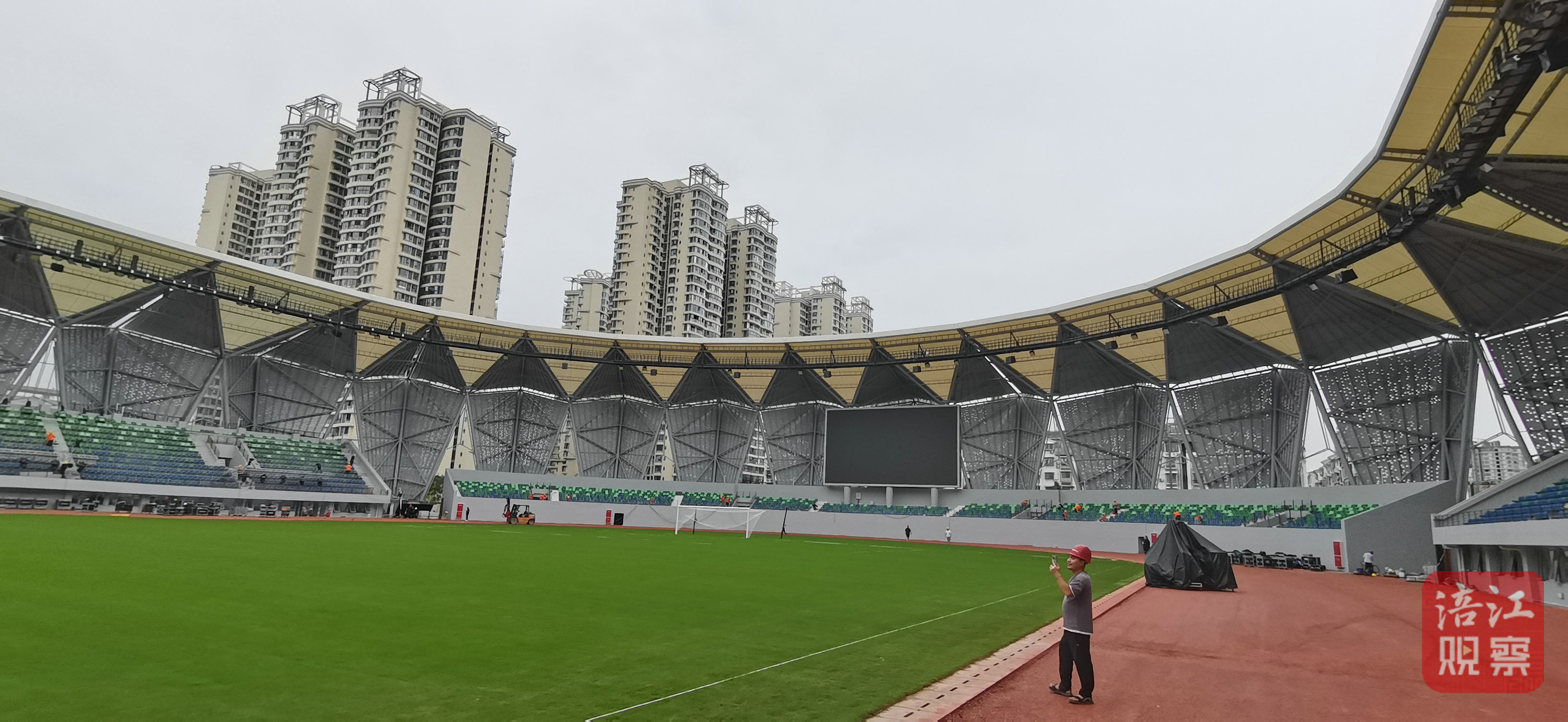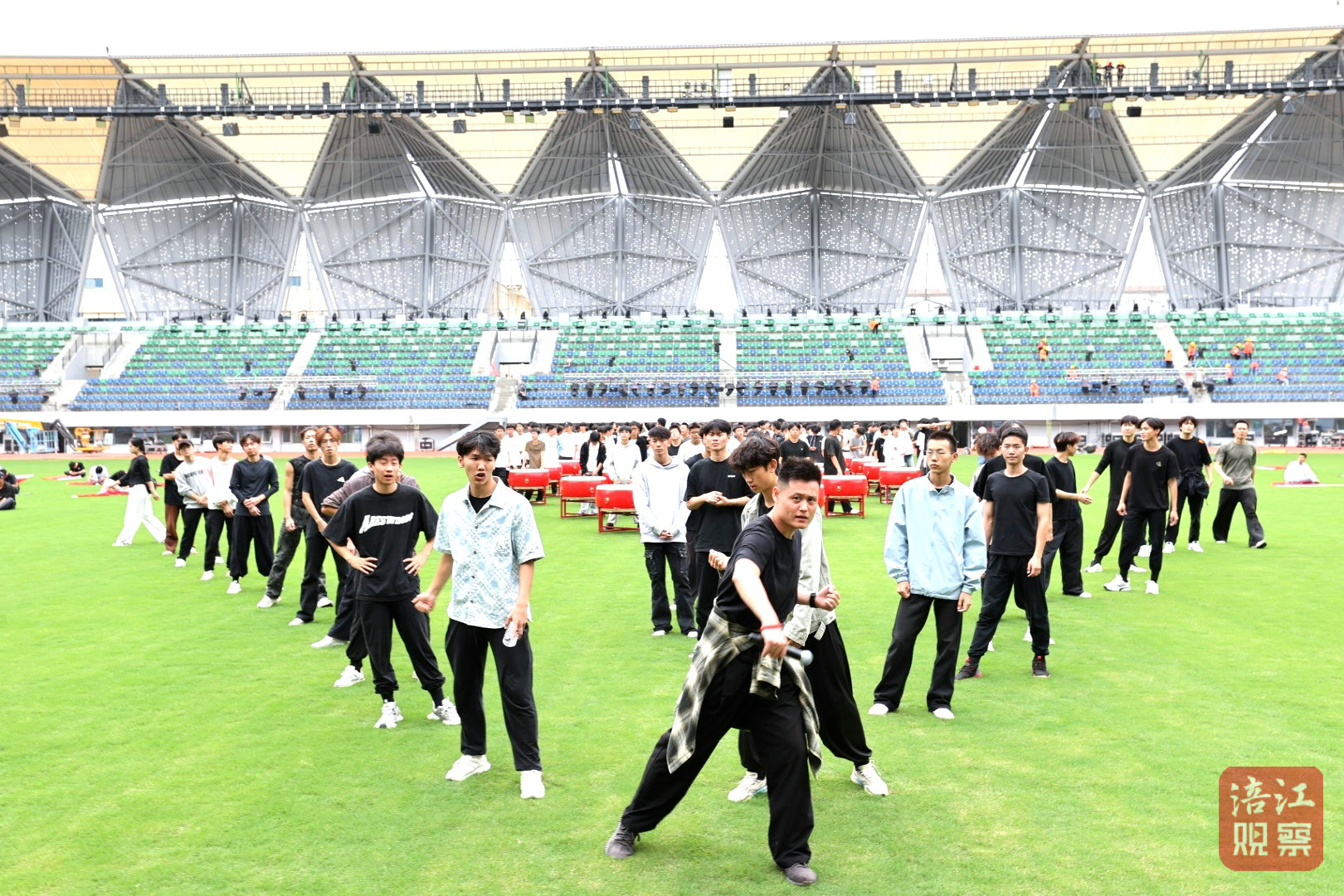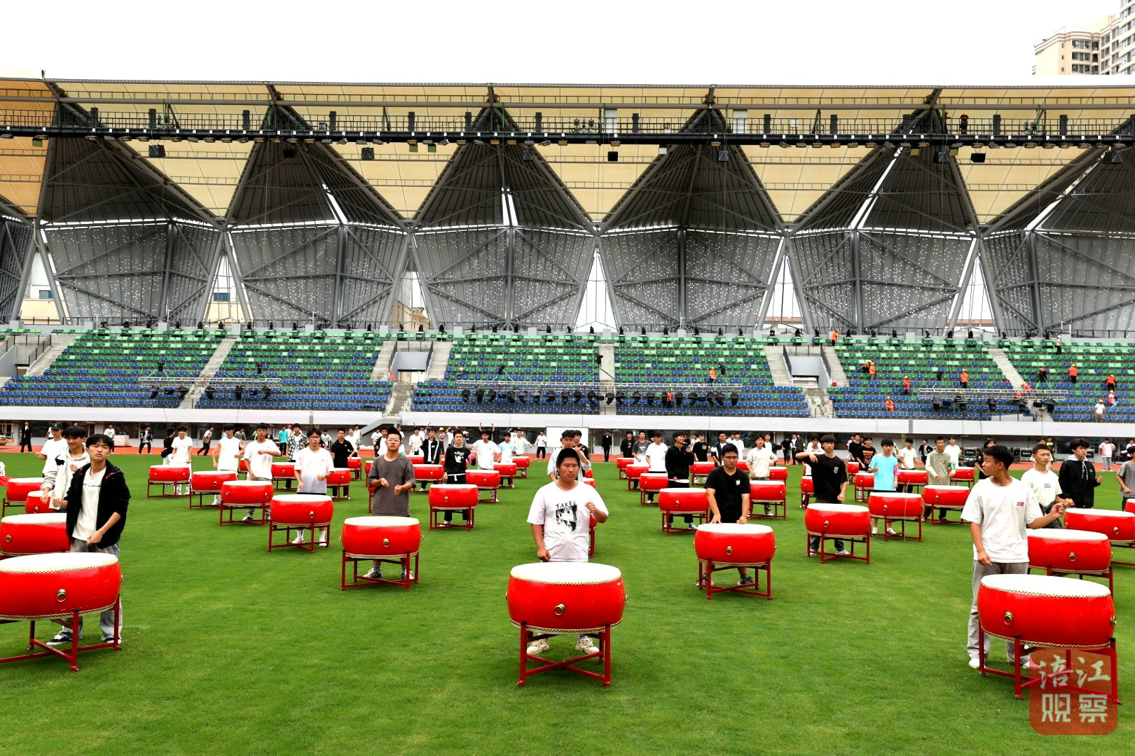 走进三台体育场,崭新的场馆映入眼帘,场内一片热火朝天的景象:一边是数百名演职人员紧张排练,另一边则是由鼓手旗手表演方队编导兼领舞陈天赐带领的队伍,他们正进行着最后的合练。