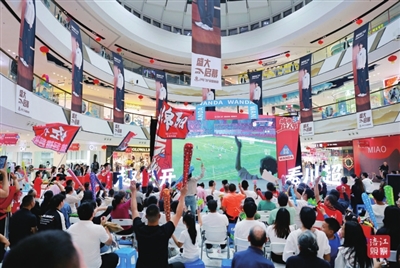 在经开区第二观赛点——经开区万达广场,几百双眼睛紧盯巨幕,小吃被遗忘在手中,直到绵阳九洲长虹队前锋突入禁区,整个现场顿时爆发出震耳欲聋的呐喊。